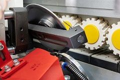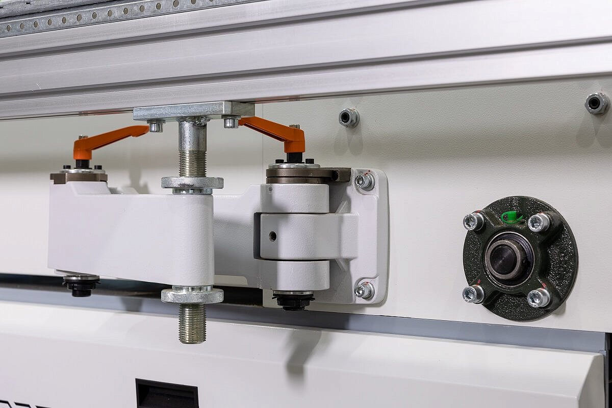 Измеритель толщины детали остановит конвейер при подаче заготовки большей толщины. Защита механизмов подачи и прижимной балки.