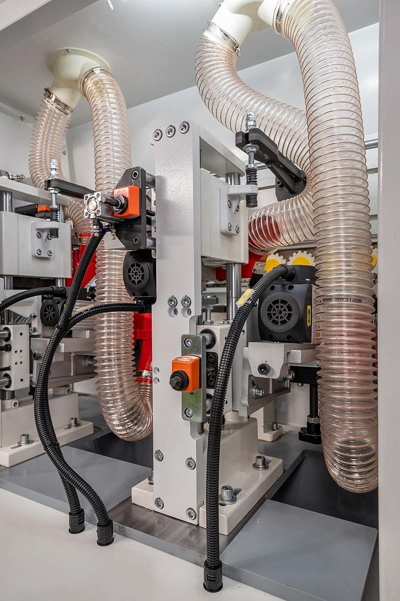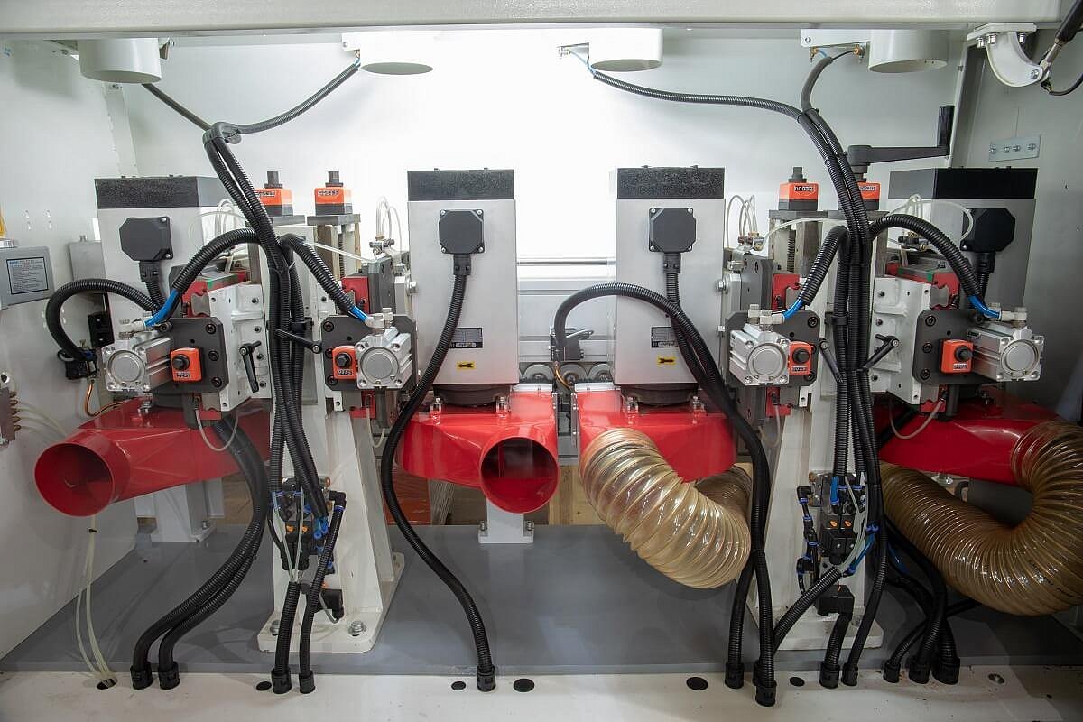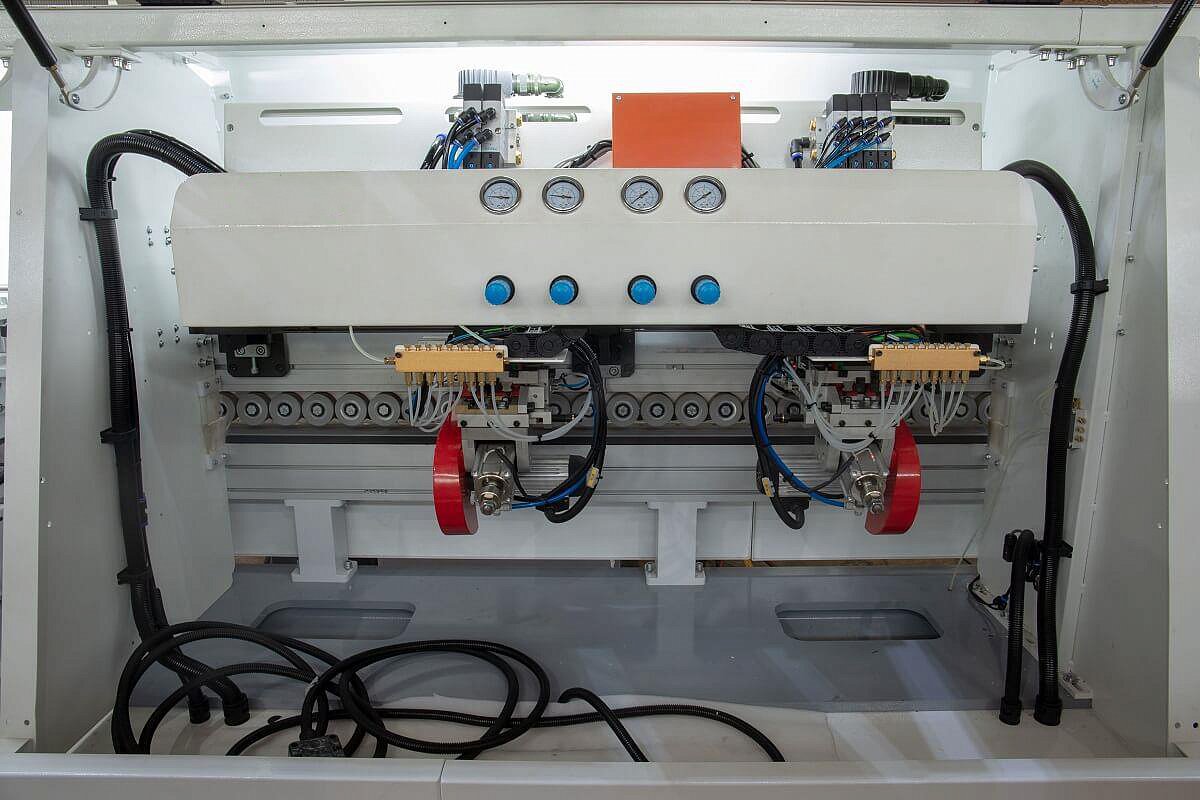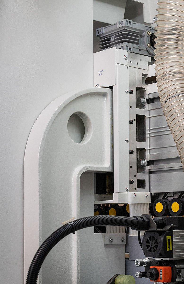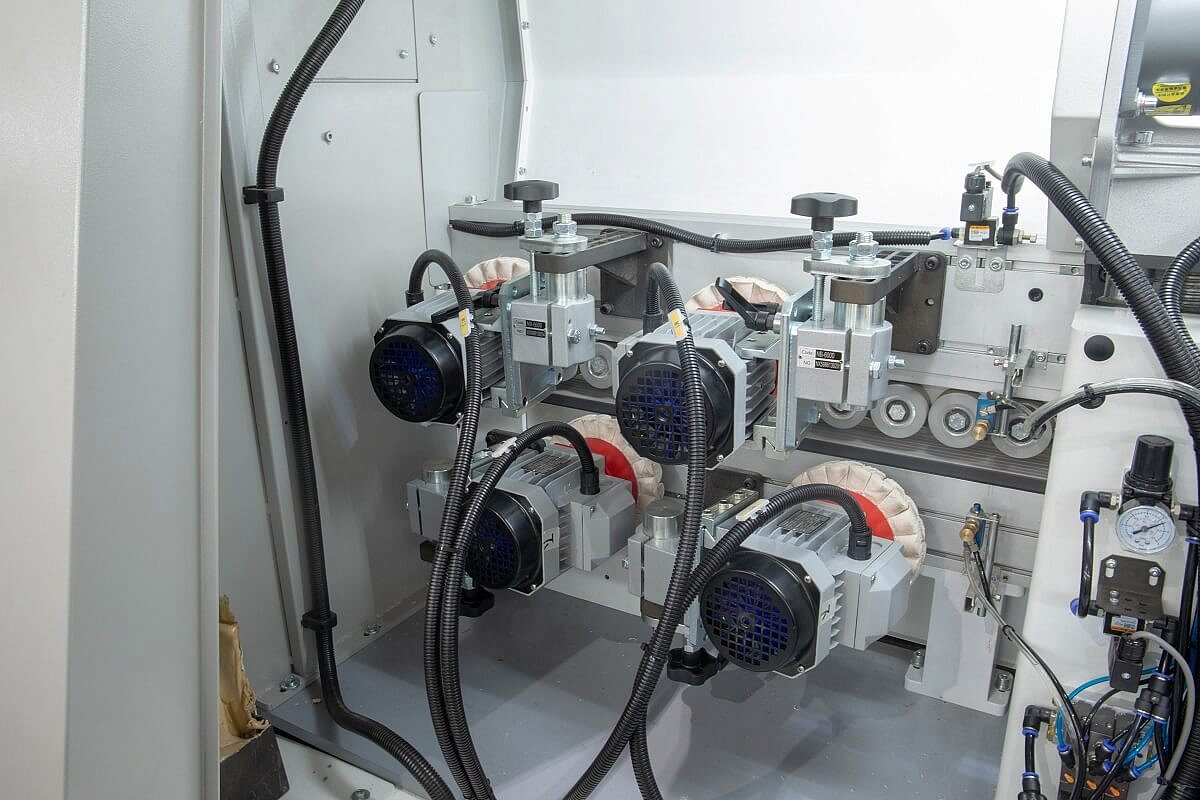 Два независимых электромотора на каждом узле работают поочередно и вращаются в разные стороны, что предотвращает вырывание кромочного материала с торца детали.