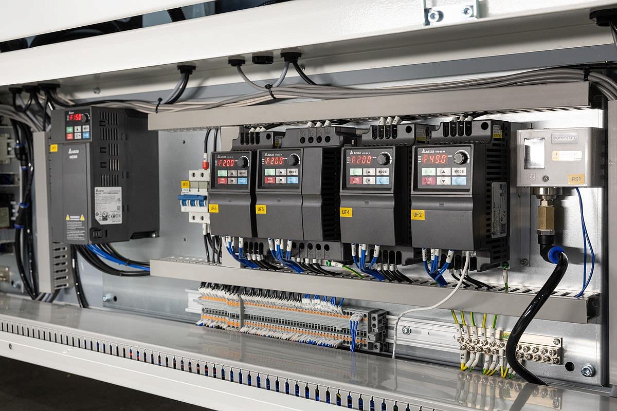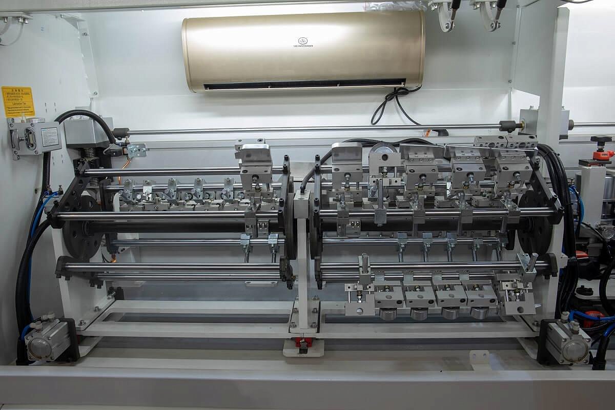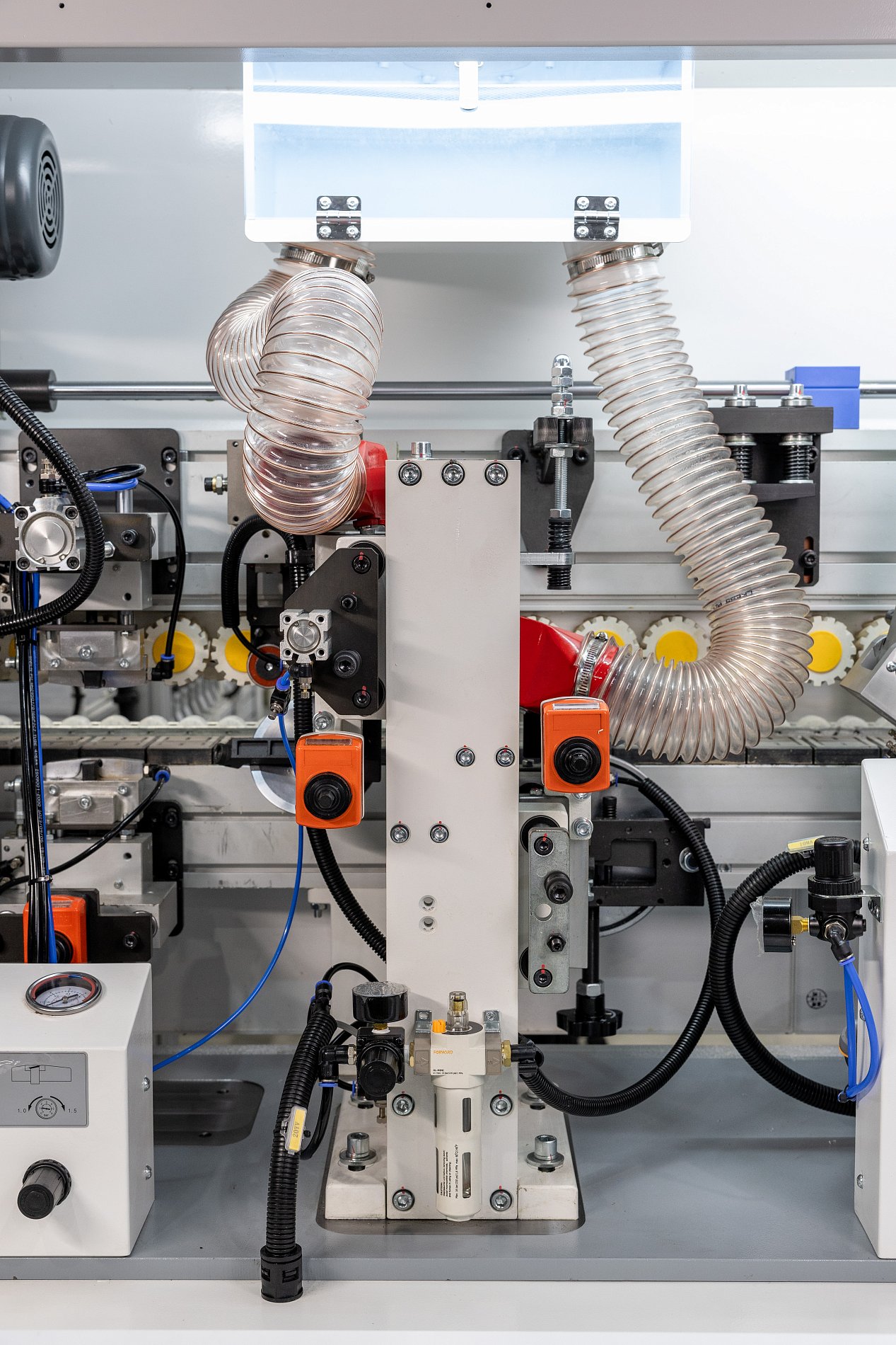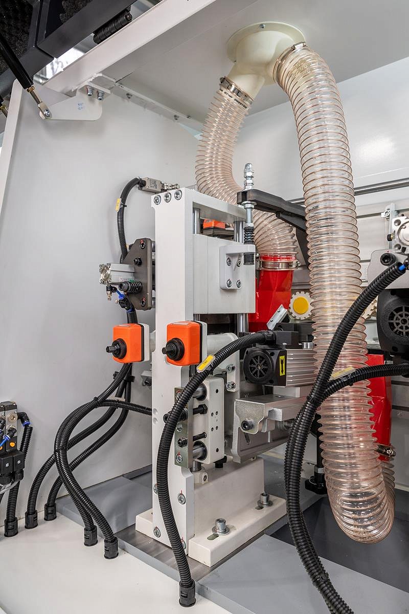 Два независимых электромотора на каждом узле работают поочередно и вращаются в разные стороны, что предотвращает вырывание кромочного материала с торца детали.
