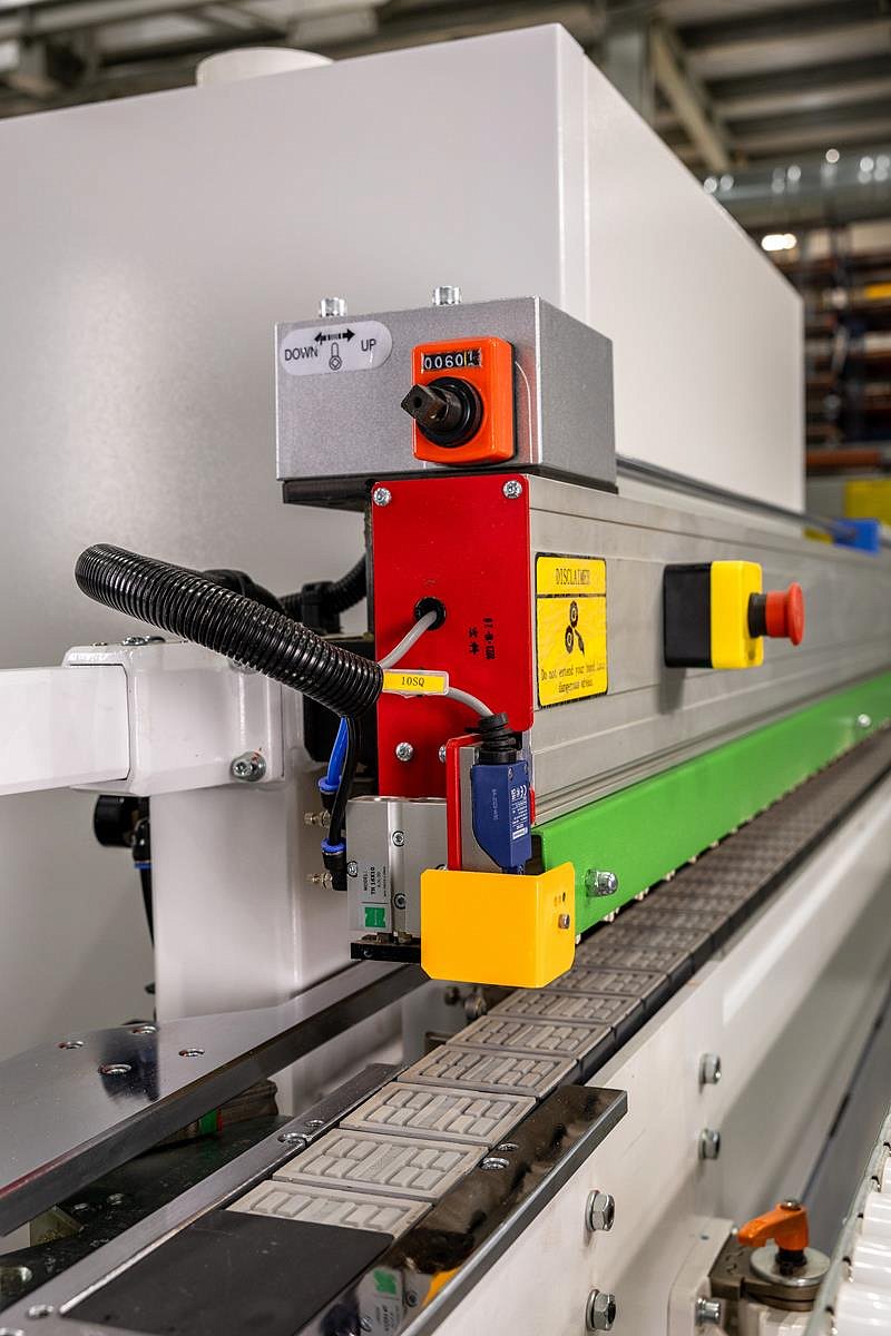 Измеритель толщины детали остановит конвейер при подаче заготовки большей толщины. Защита механизмов подачи и прижимной балки.