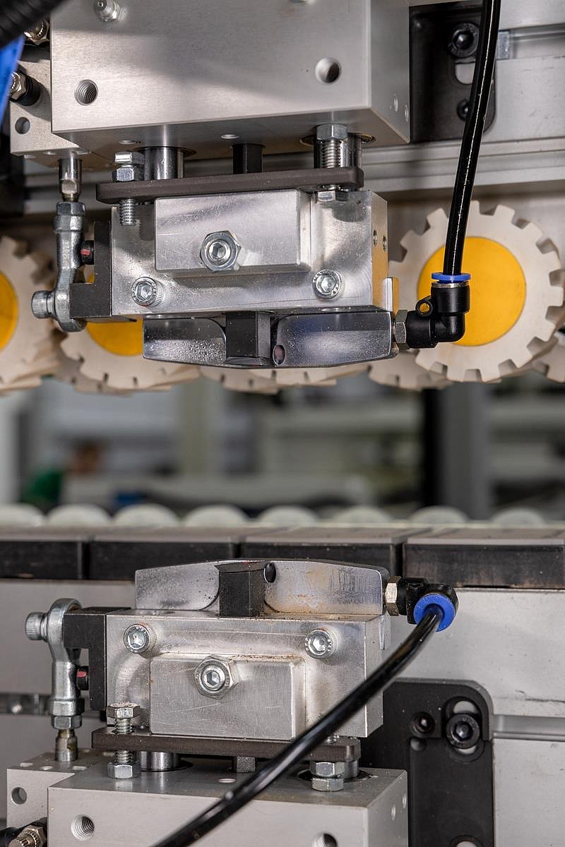 Длинная прямая полукруглая направляющая конвейера гарантирует прямолинейное движение деталей без смещений.